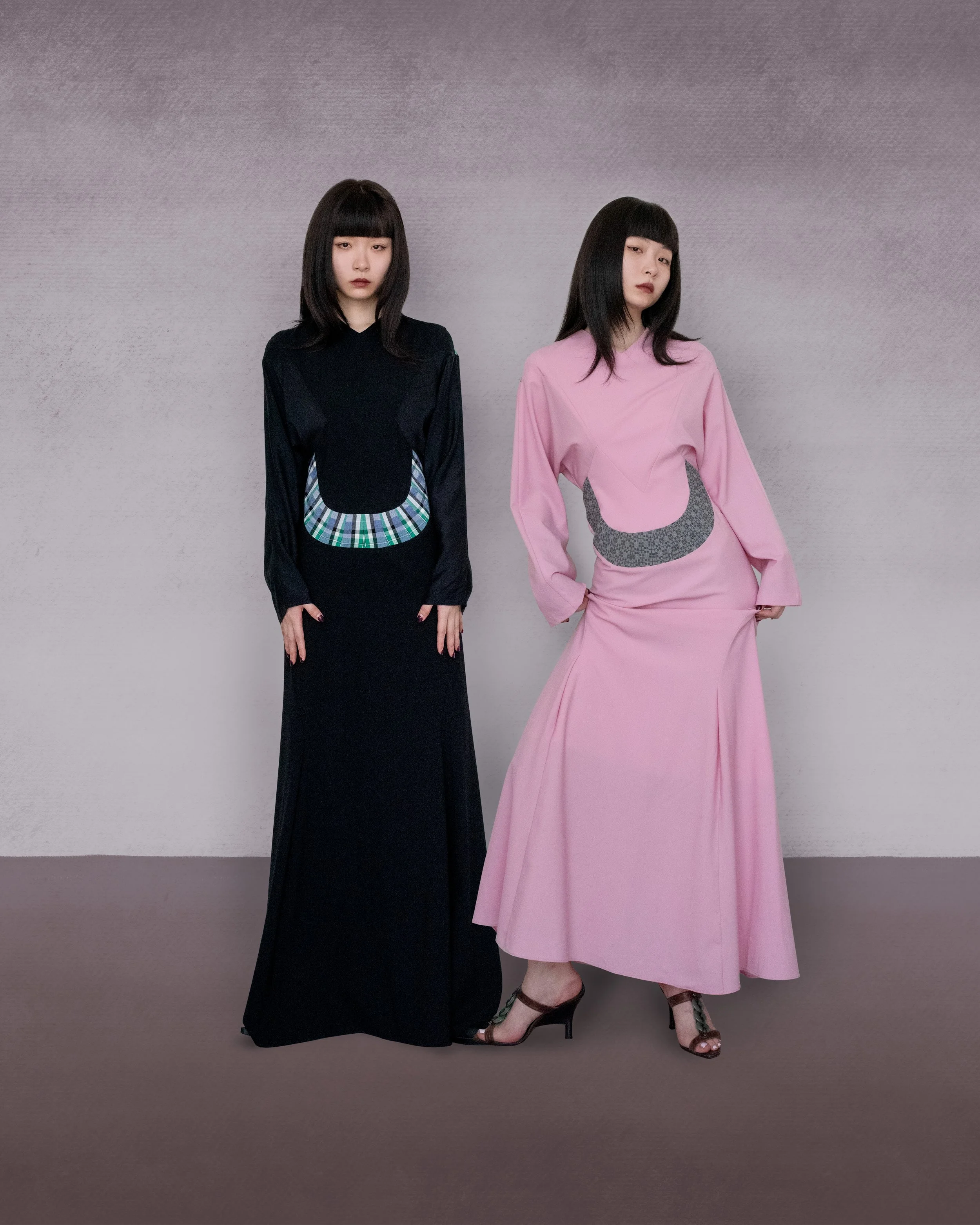 In terms of cut, the collection avoids references to any specific era or culture, instead focusing on the interaction between ornament and the body. The placement, scale, and shape of stripes and checks on the body are carefully calibrated. These ornaments draw the wearer’s bodily awareness toward the chest, the waist, the shoulders, and so on—sites tied to our sense of bodily subjectivity. Boundaries begin to dissolve: between ornament and function, the avant-garde and the traditional. These distinctions are no longer clearly drawn.